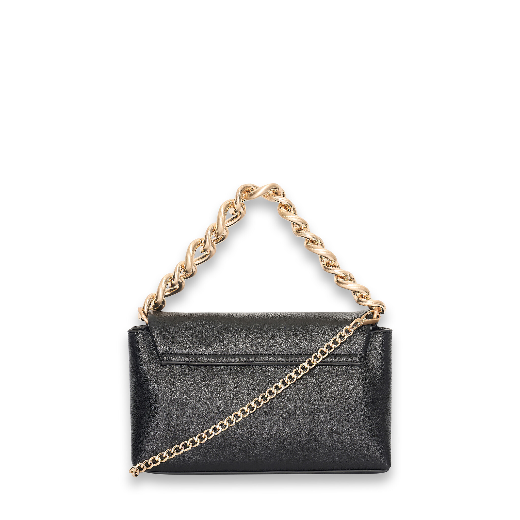 This modern black Arm candy crossover, is a multifunctional bag which is perfect for daily use, or an evening out. This bag has a short, single strap and wears comfortably in the hand. Thanks to the additionally supplied long (adjustable) and detachable shoulder strap, the bag can be worn in different ways. The bag has a spacious main compartment and two relatively small inner pockets, of which one with a zipper. The bag closes with a flap and a push button. The colour of the hardware is gold. The sizes (widht x height x depth) of this bag are 22,5x12,5x8