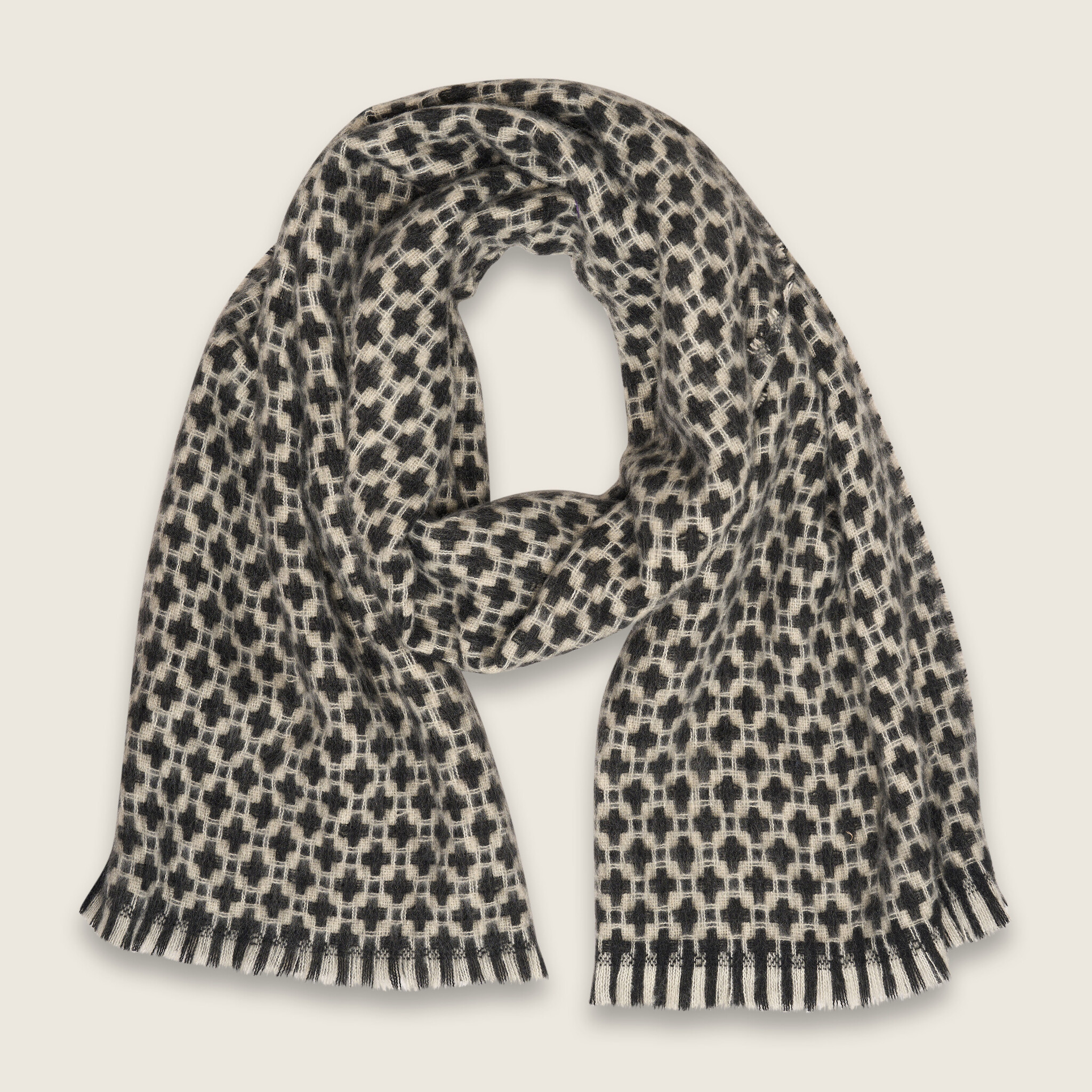 Fancy bouclé shawl made of 100% polyester with an ikat print.