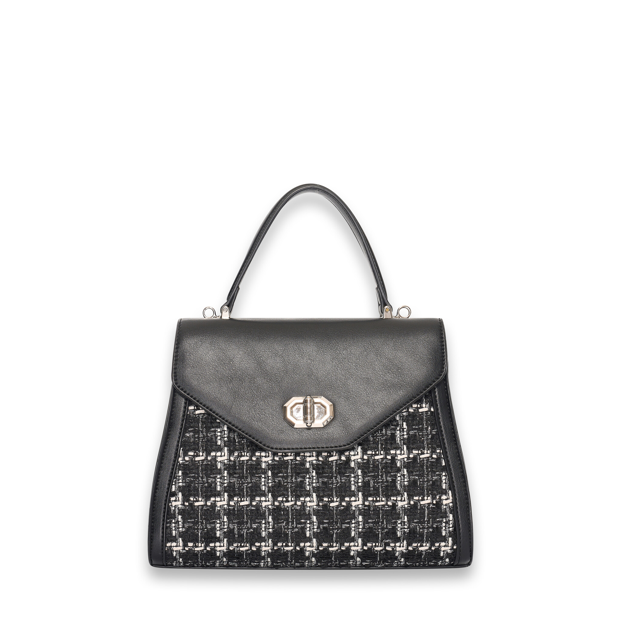 This posh black Carly handbag, is a perfect bag for daily use. This handbag has a short, single strap and can be worn over the shoulder thanks to the additional shoulder strap. The bag has a spacious main compartment and two relatively small inner pockets, of which one with a zipper. Through a flap and closure at the front, this bag can be securely locked. The colour of the hardware is silver. The sizes (widht x height x depth) of this bag are 26x20x9