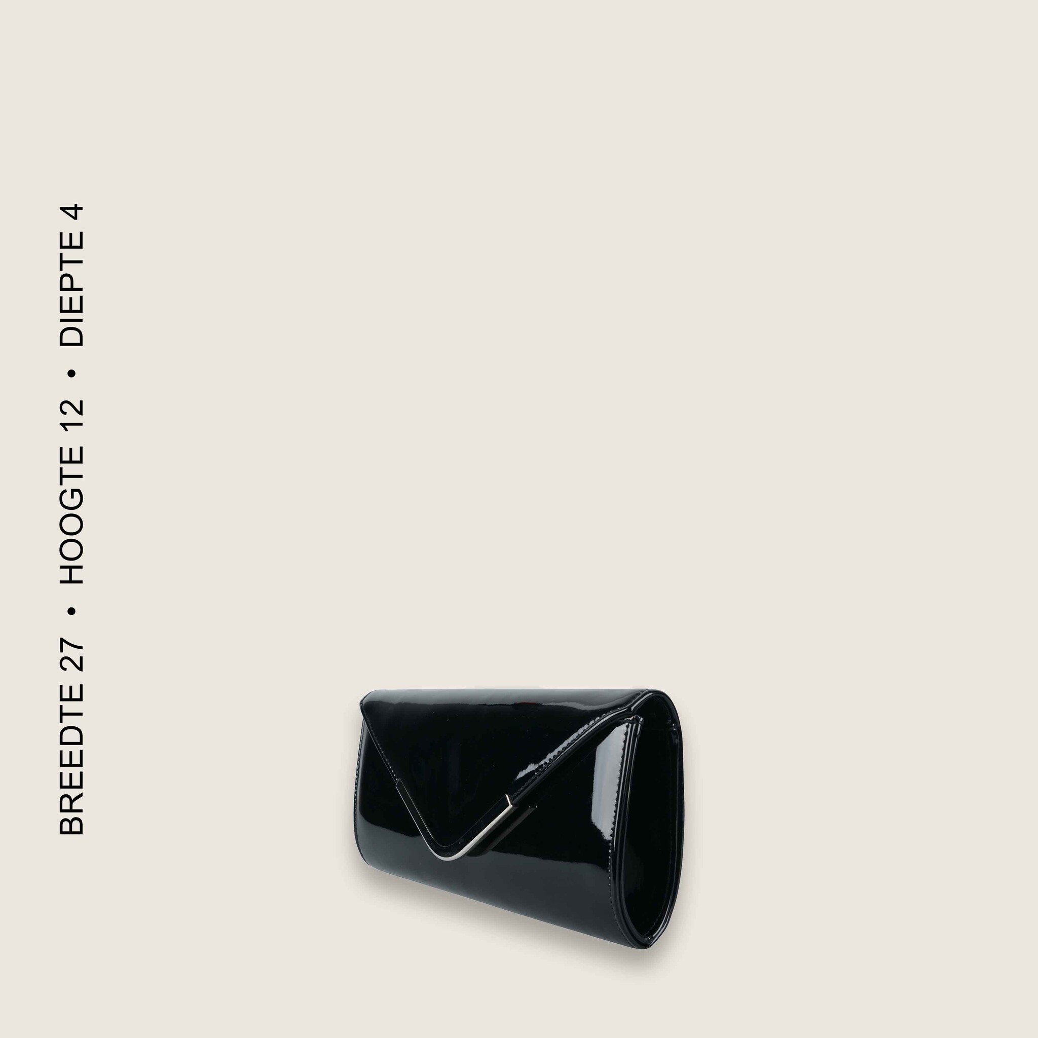 This timeless black clutch bag is made of beautiful lacquer material. This envelope clutch bag can be closed via a magnet closure and can be worn in different ways over the shoulder with a detachable short and long chain strap. This is also a perfect bag to elegantly hold in your hand on a night out. The sizes (length - height - depth) of this bag are: 27 x 12 x 4 cm.