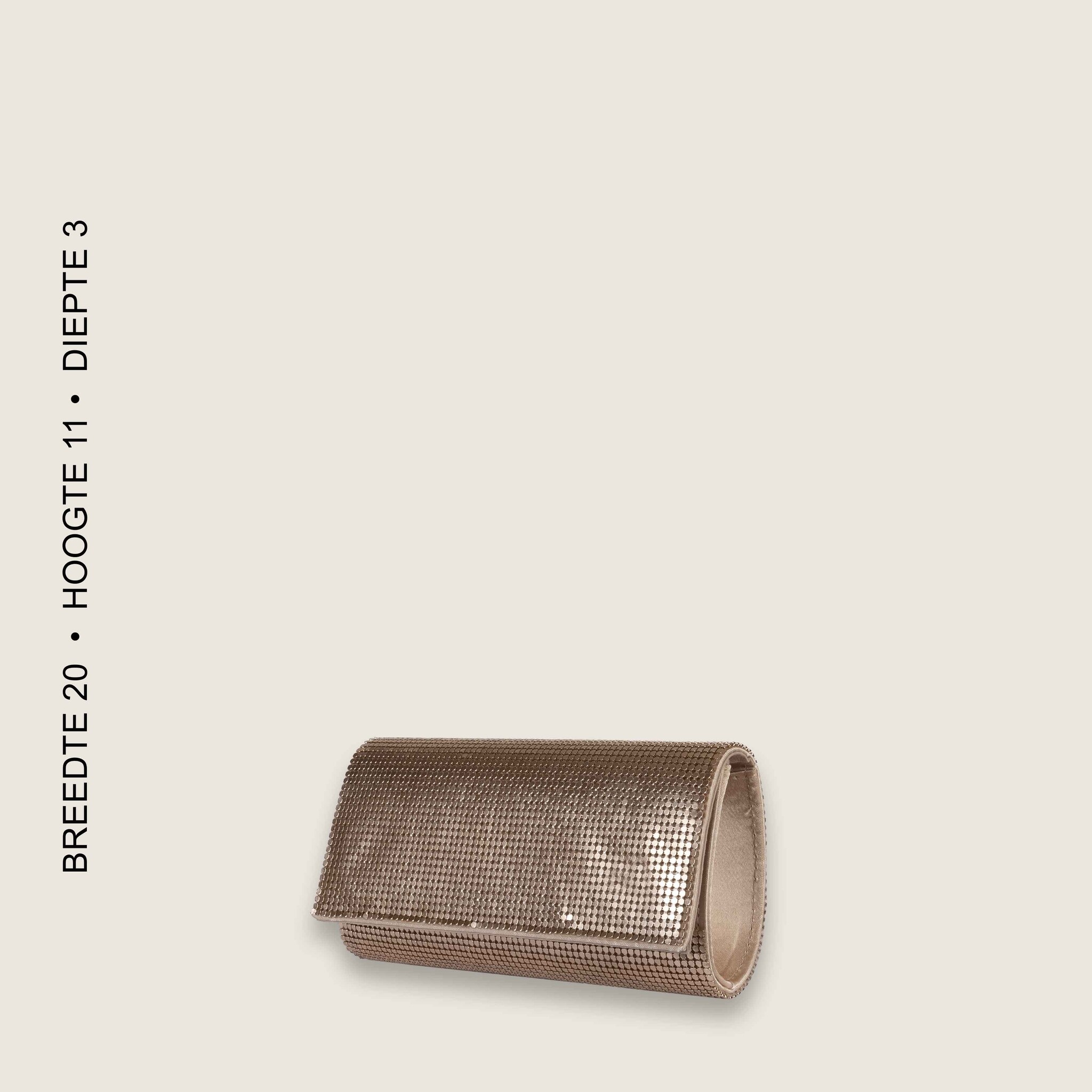 This stylish gold envelop Felicity , has a unique look. This bag can be worn over the shoulder because of the additionally supplied shoulder strap. On the interior, there is The colour of the hardware is l.gold The sizes (widht x height x depth) of this envelop are 20x11x3