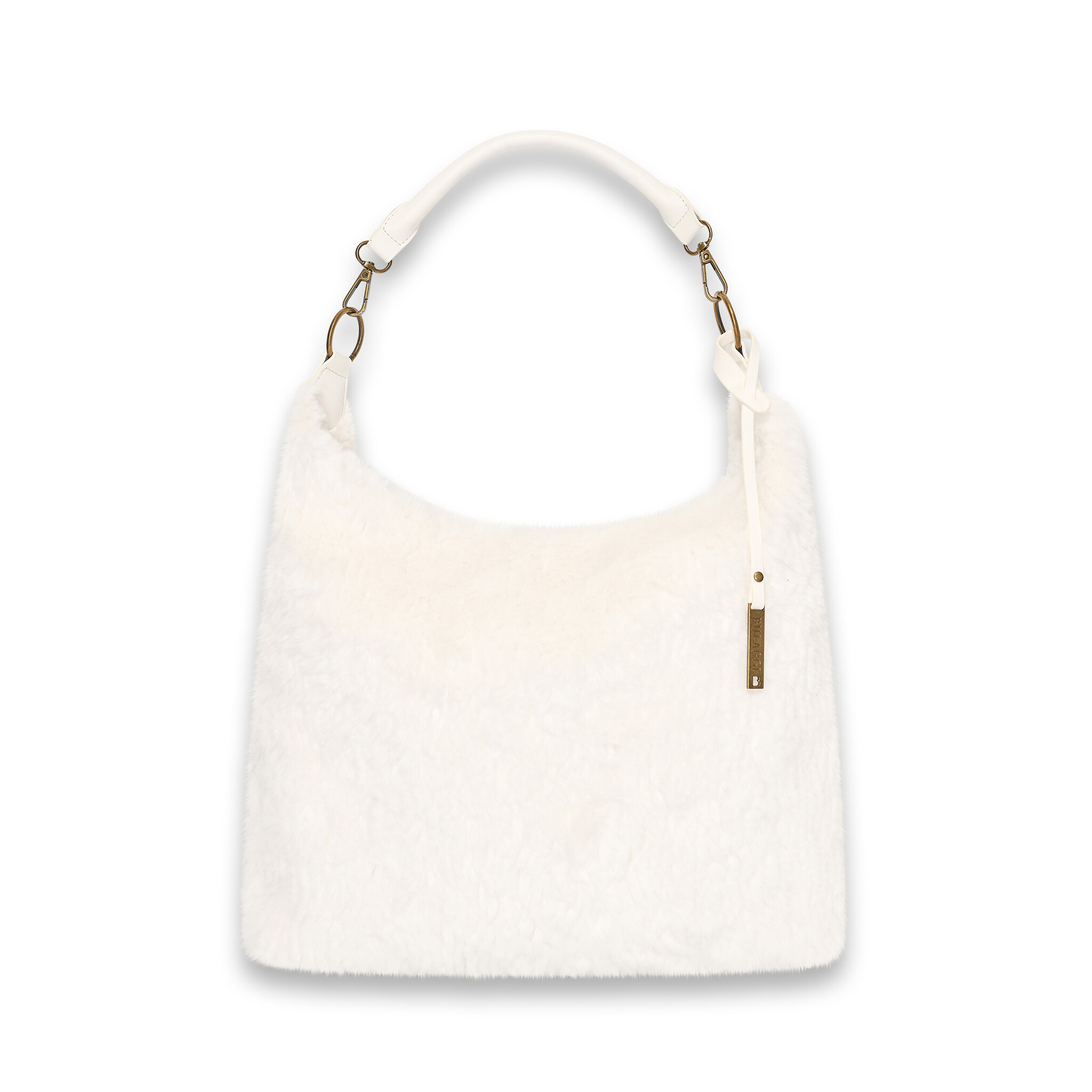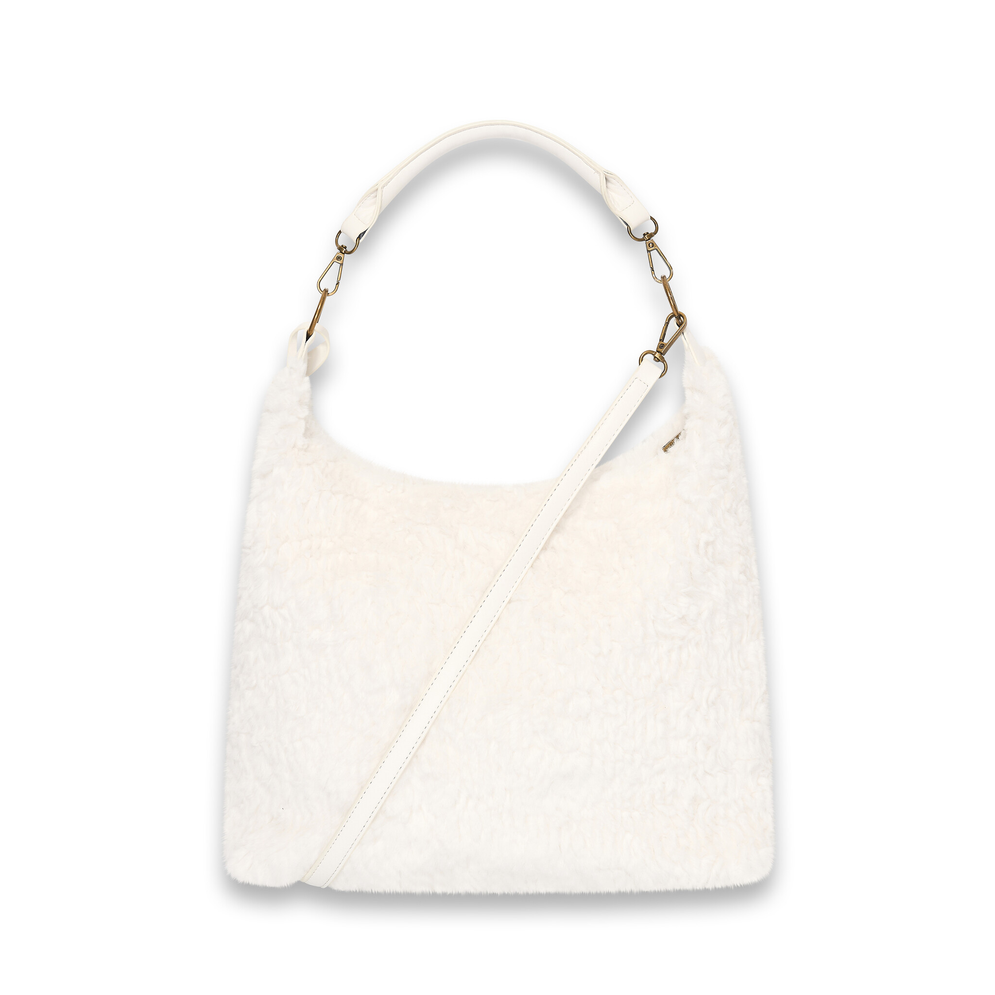 This fluffy creme Faux fur hobo, is compact, but super functional. You can store all your essentials in this bag. This hobo bag has a short (non adjustable) single shoulder strap which comfortably wears over the shoulder. Thanks to the additionally supplied long (adjustable) and detachable shoulder strap, the bag can be worn in different ways. The bag has two compartments of which one closes with a zipper. The bag can be closed with a zipper. The colour of the hardware is called 'antique brush' and has a messing colour, like polished gold. The sizes (widht x height x depth) of this bag are 33x10