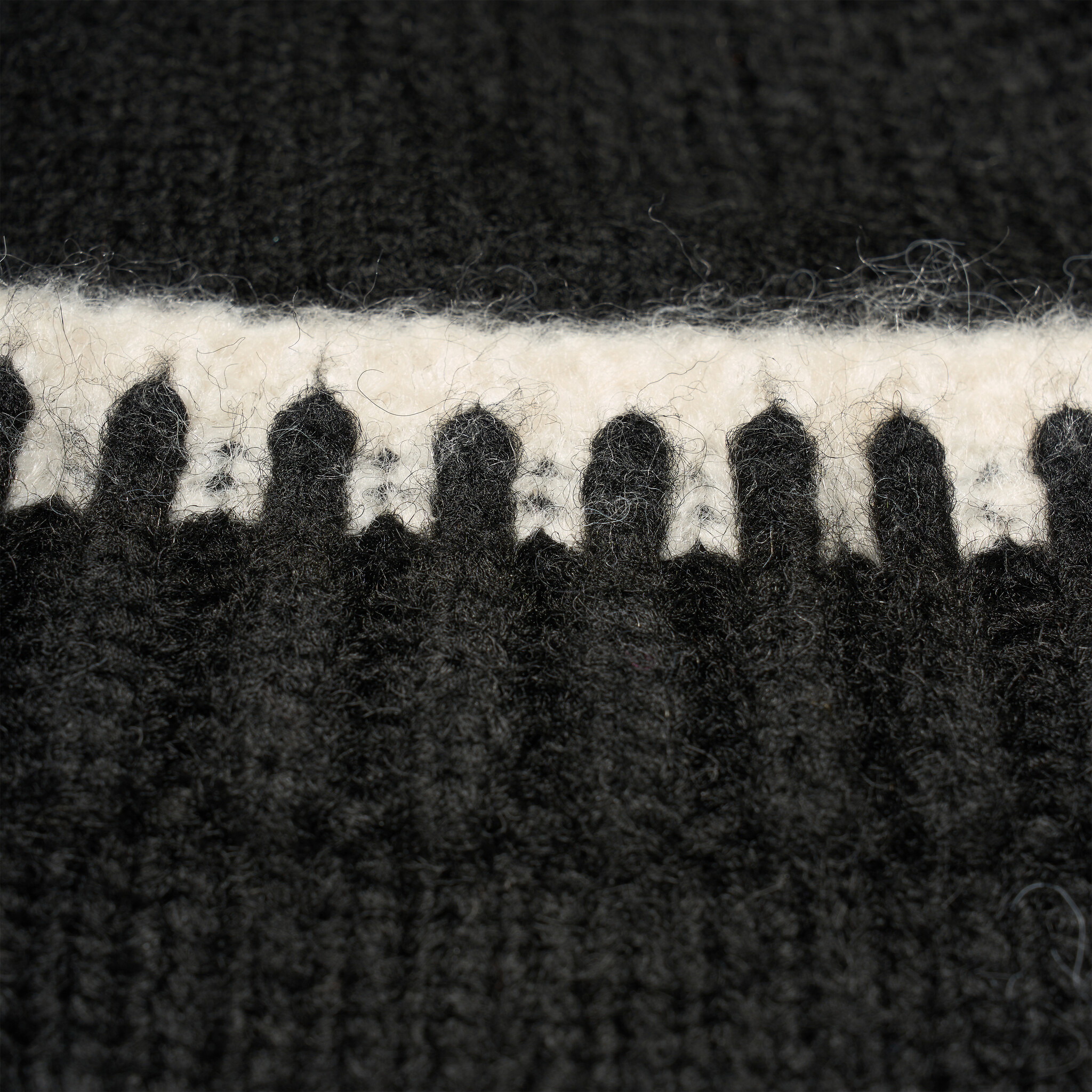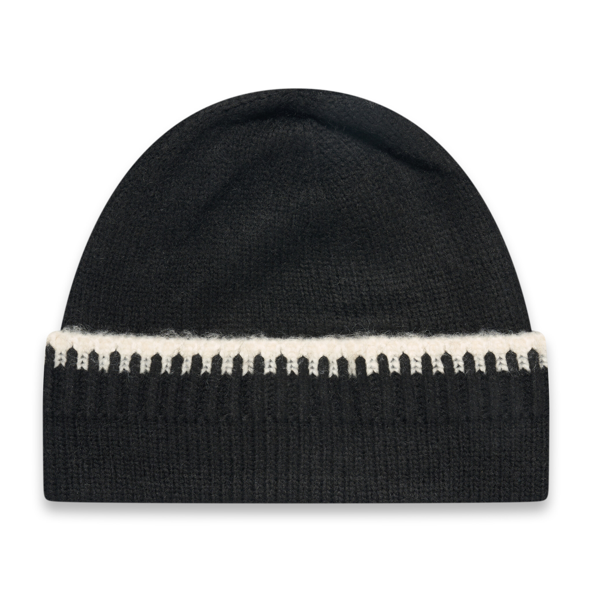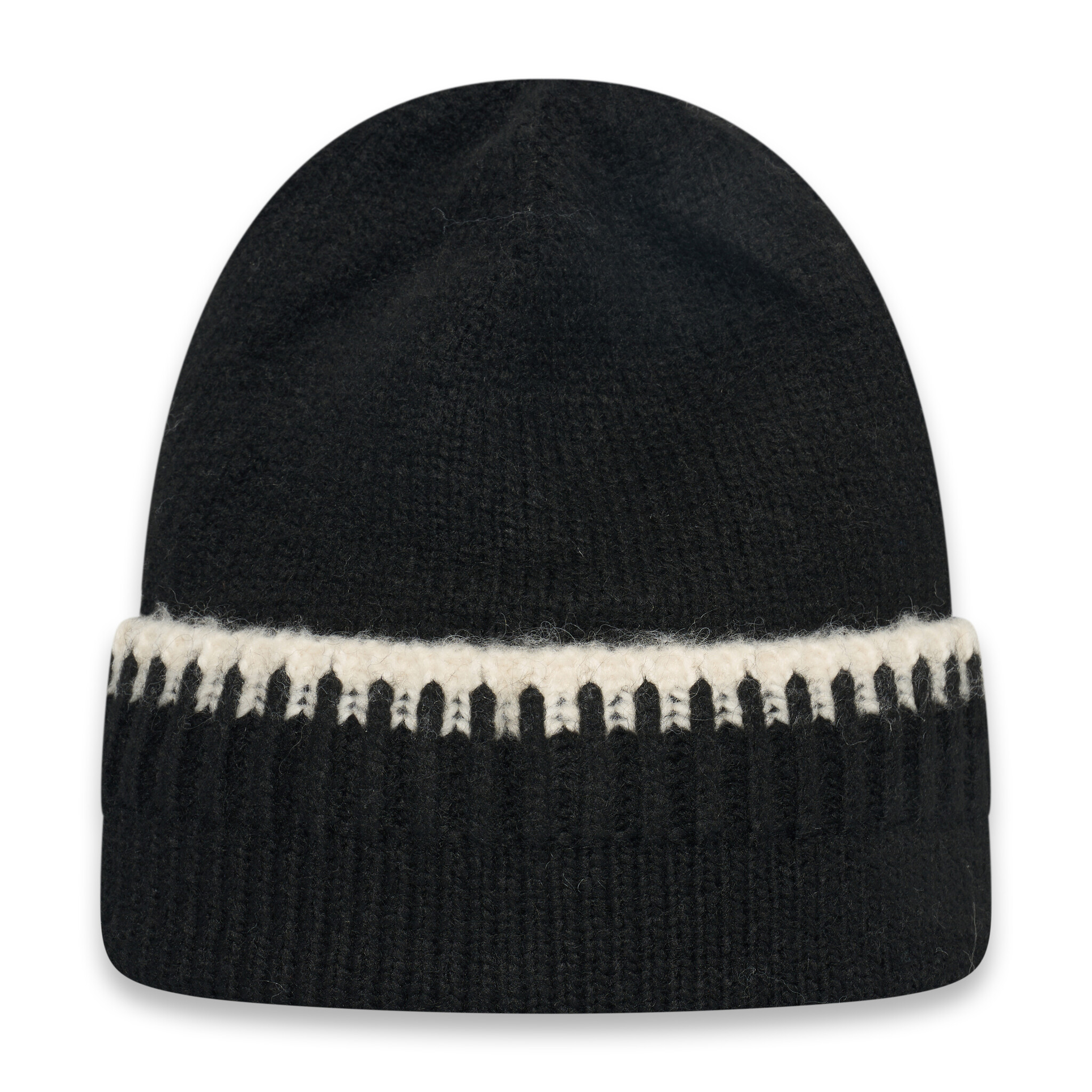 Black knitted beanie made of 6% wool, 10% nylon, 10% acrylic, 74% polyester