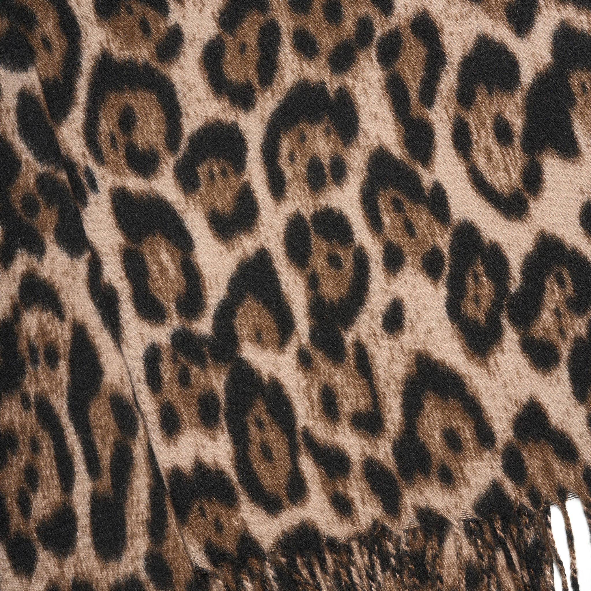Camel scarf with panther print made of 100% polyester with a size of 67 by 175 cm.