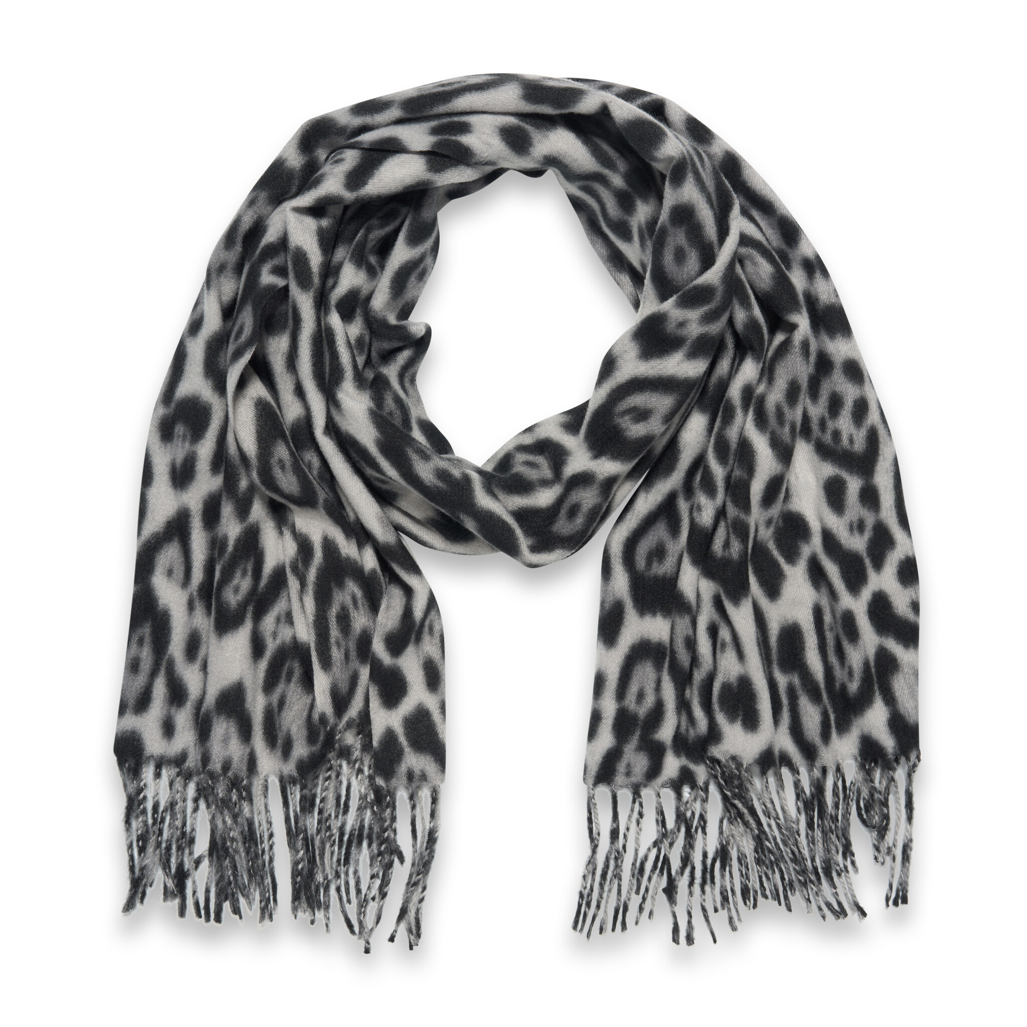 Gray scarf with panther print made of 100% polyester with a size of 67 by 175 cm.