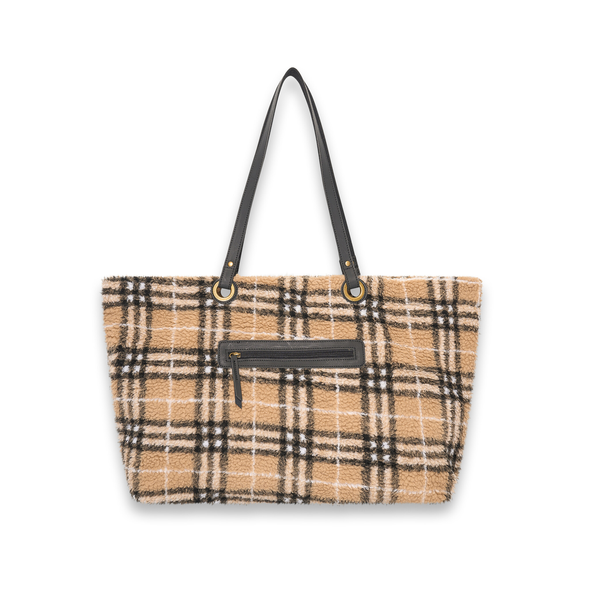 This elegant creme Teddy checkered shopper, is a stylish bag with an awesome print. This shopping bag has double (non adjustable) straps which can be worn comfortably over the shoulder. Thanks to the additionally supplied long (adjustable) and detachable shoulder strap, the bag can be worn in different ways. The bag has two compartments of which one closes with a zipper. This bag closes with magnetic clasp closure. The colour of the hardware is called 'antique brush' and has a messing colour, like polished gold. The sizes (widht x height x depth) of this bag are 49x37x18