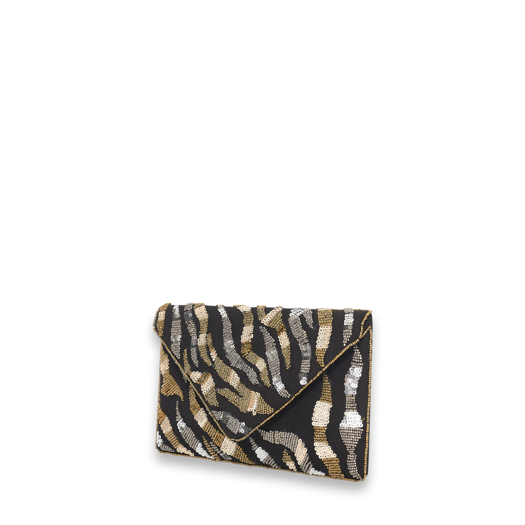 This bubbly black Zebra clutch, is an absolute bag must-have to go out with. With this clutch bag, you will receive an adjustable shoulder strap. This way you do not only have to hold this bag in your hand, but you can also wear it over the shoulder. On the interior, this bag has one main compartment with one slip pocket. The bag closes with a flap and two magnet snap closures. The colour of the hardware is silver. The sizes (widht x height x depth) of this bag are 25x15,5x1
