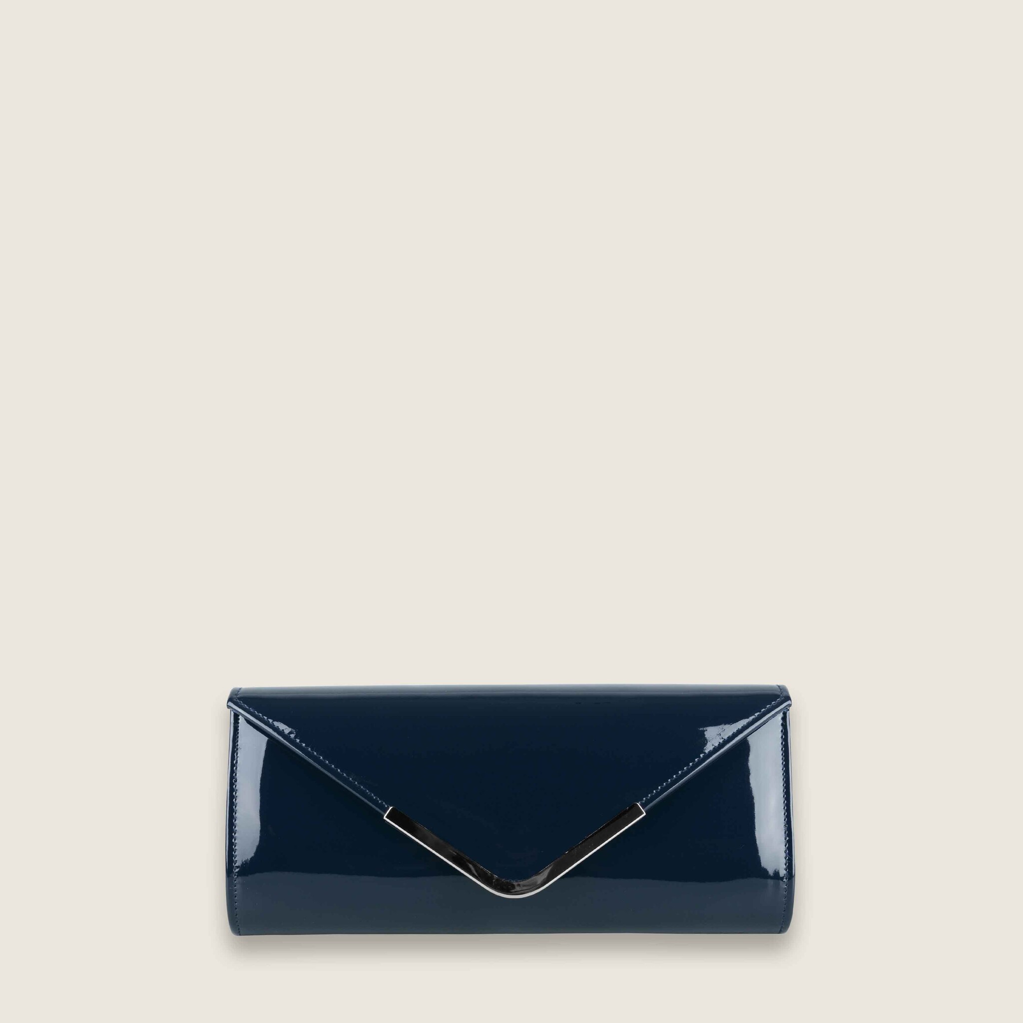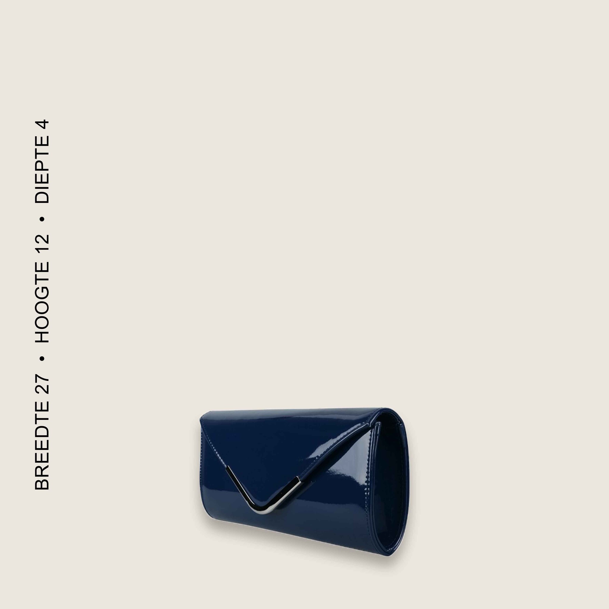 Deze tijdloze donkerblauwe clutch is uitgevoerd in mooi lak materiaal. De clutch wordt afgesloten door middel van een magneet drukknoop en kan op verschillende manieren op de schouder gedragen worden door een afneembare korte- en een lange schakelketting. Een perfecte clutch voor een avondje uit of chique diner! De afmetingen (breedte x hoogte x diepte) van dit tasje zijn 27 x 12 x 4 cm.