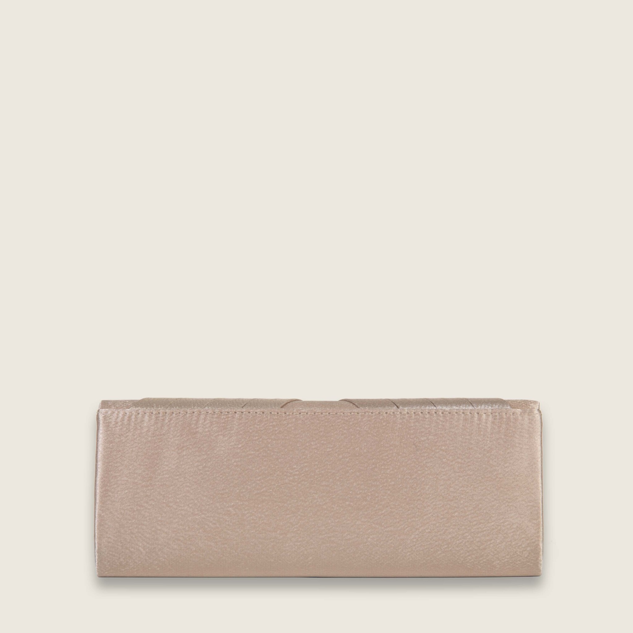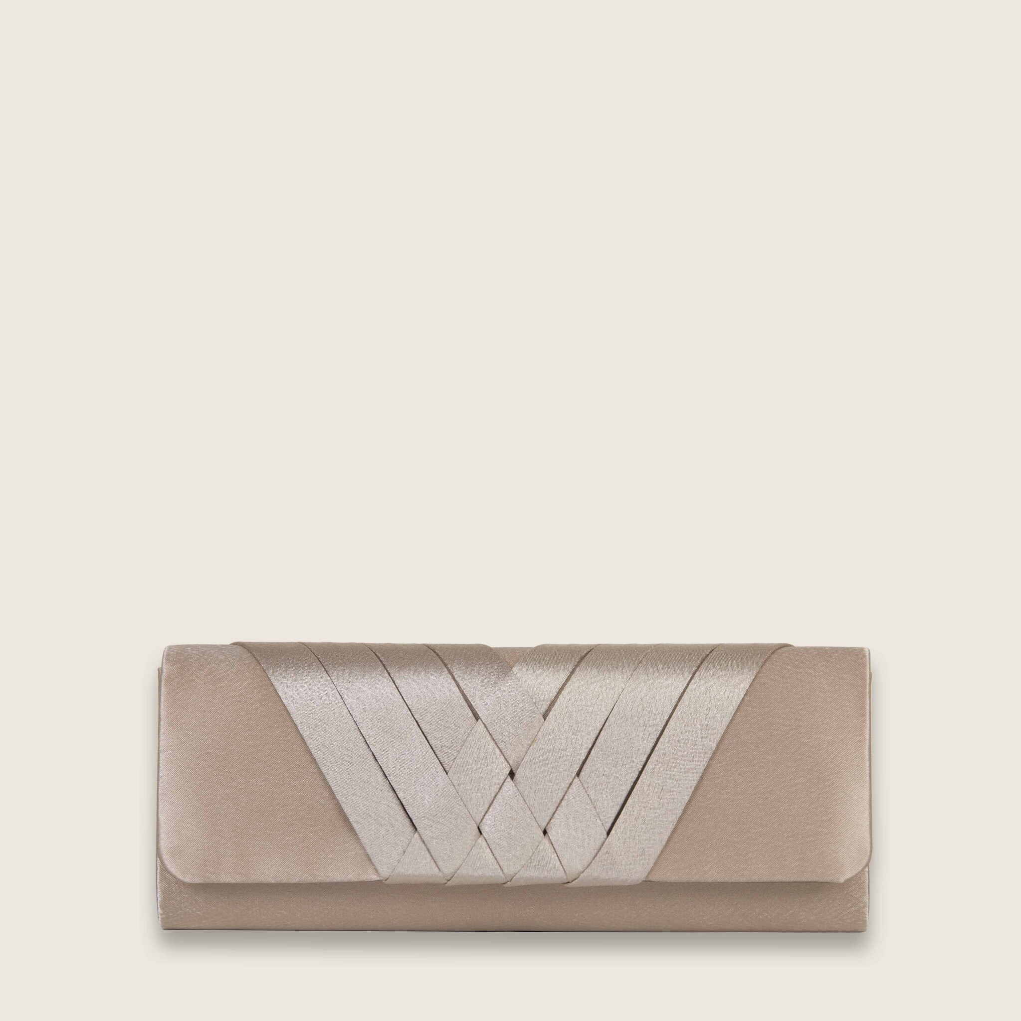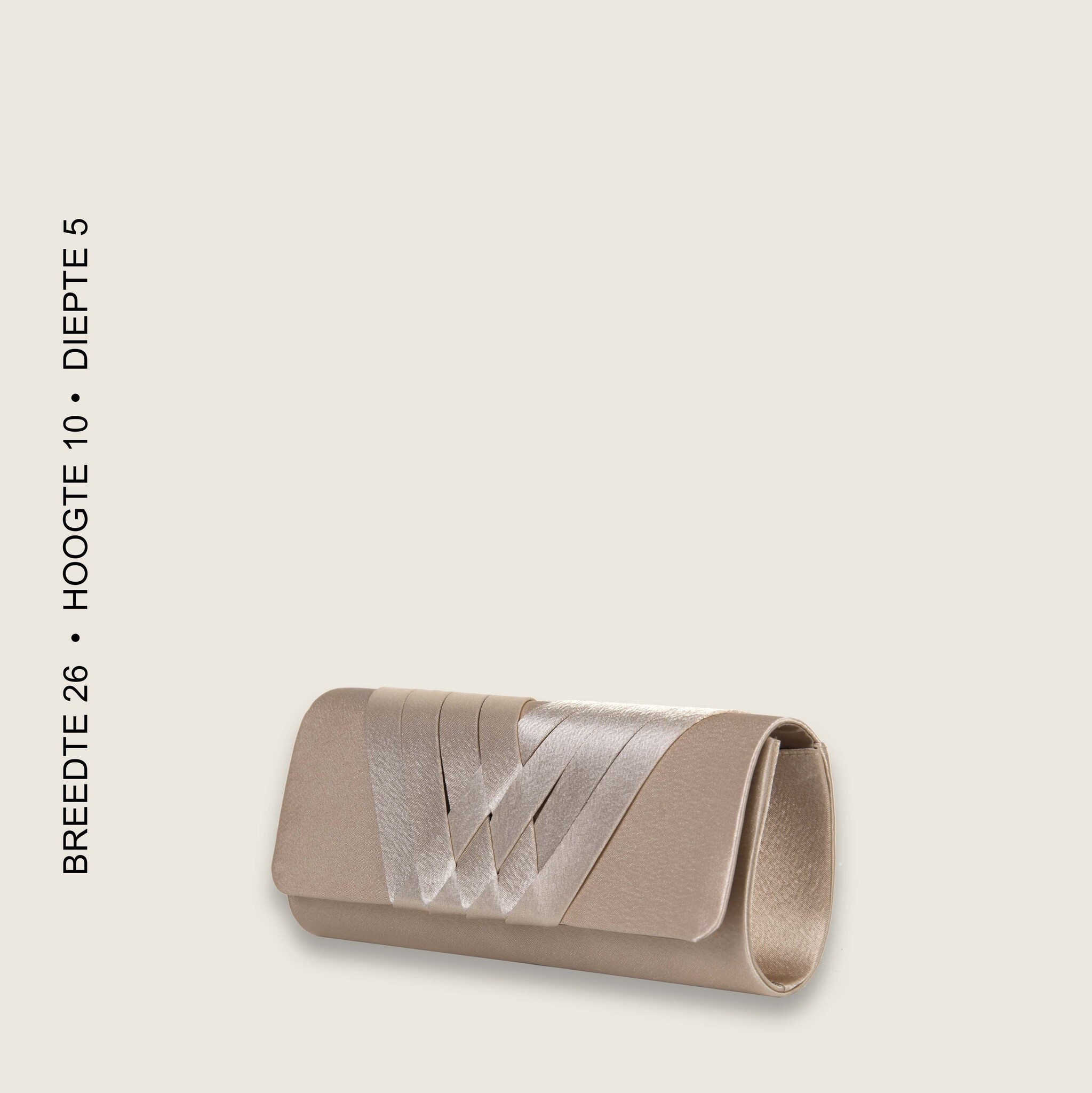 Met deze champagne kleurige satijnen clutch met gevlochten detail creëer je heel makkelijk een high end look. Dit sierlijke exemplaar is door zijn ronde vorm gemakkelijk onder de arm of in de hand te dragen. De clutch is afsluitbaar met een magneten drukknoop en is behalve als clutch ook aan de schouder te dragen. Kortom met dit item steel je absoluut de show en is dus onmisbaar bij jouw feestoutfit! De afmetingen (breedte x hoogte x diepte) van dit tasje zijn 26 x 10 x 5 cm.