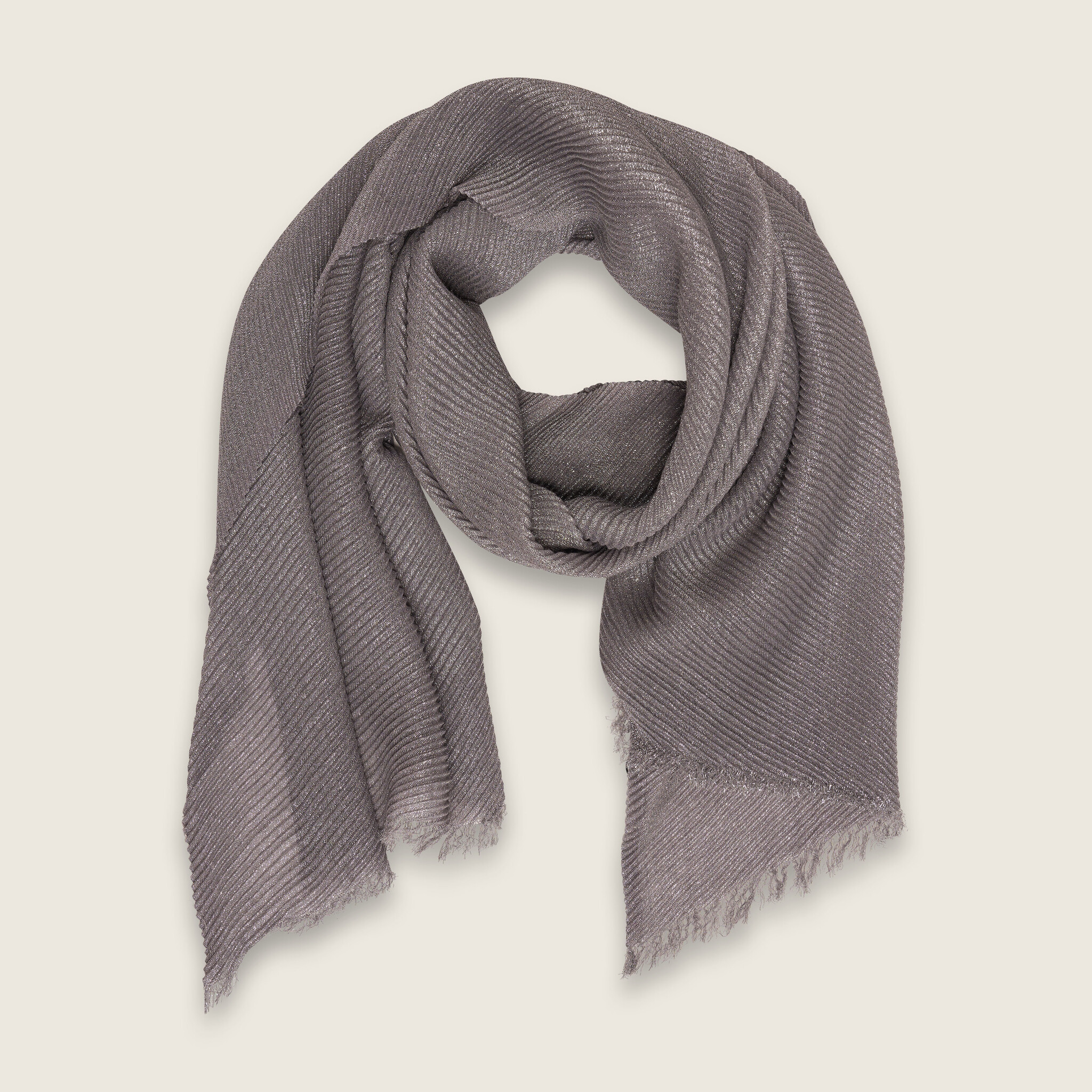 Uni kleurige donker grijze plissee shawl gemaakt van 80% polyester en 20% lurex, de shawl heeft een afmeting van 65 bij 180 cm.