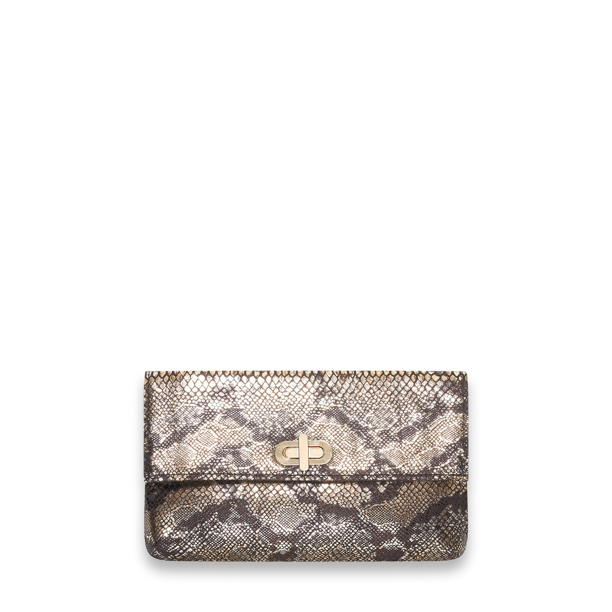 Deze rijk uitziende zwarte Snake clutch , is een stijlvolle tas met een te gekke print. De crossbody tas heeft een niet verstelbare schouderketting. Dankzij de extra meegeleverde lange (verstelbare) en afneembare schouderriem, kan de tas op verschillende manieren worden gedragen. Aan de binnenkant heeft deze tas een hoofdcompartiment met één binnenvakje. Middels een overslag en sierlijke sluiting aan de voorkant kan de handtas worden afgesloten. De metaalkleur is goudkleurig. De afmetingen (breedte / hoogte / diepte) van deze tas zijn 25x16x3
